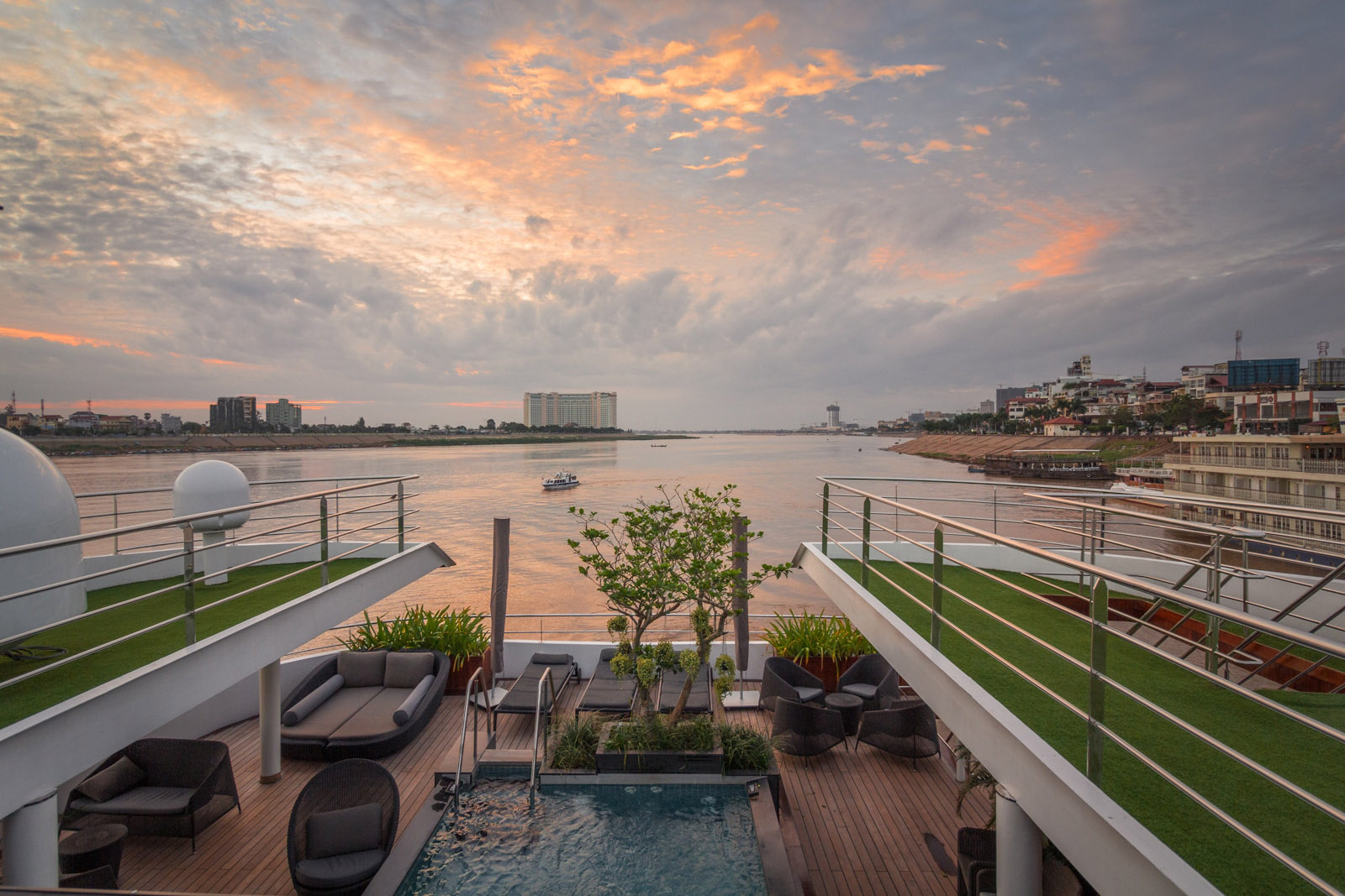 Explore the light-filled public spaces and lounge areas, where you can relax, indulge and dream, as the magical Vietnamese and Cambodian landscapes float by. You can also join daytime activities as a galley or bridge and engine room tour, Asian cooking and tropical fruit tasting..